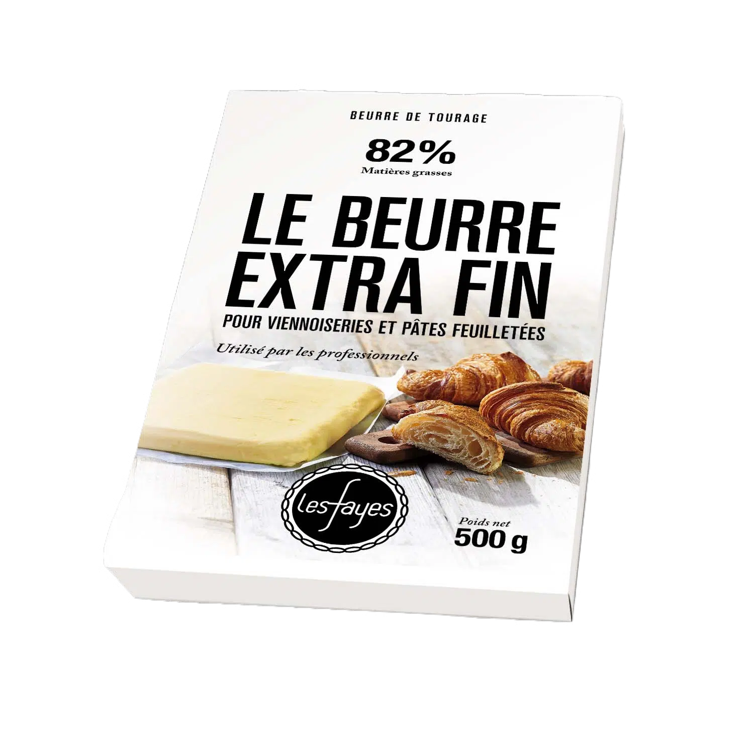 Le Beurre Les Fayes Extra Fin en plaque de 500g. Avec 82% de matières grasses, il est parfait pour réaliser soi-même ses viennoiseries et ses pâtes feuilletées.