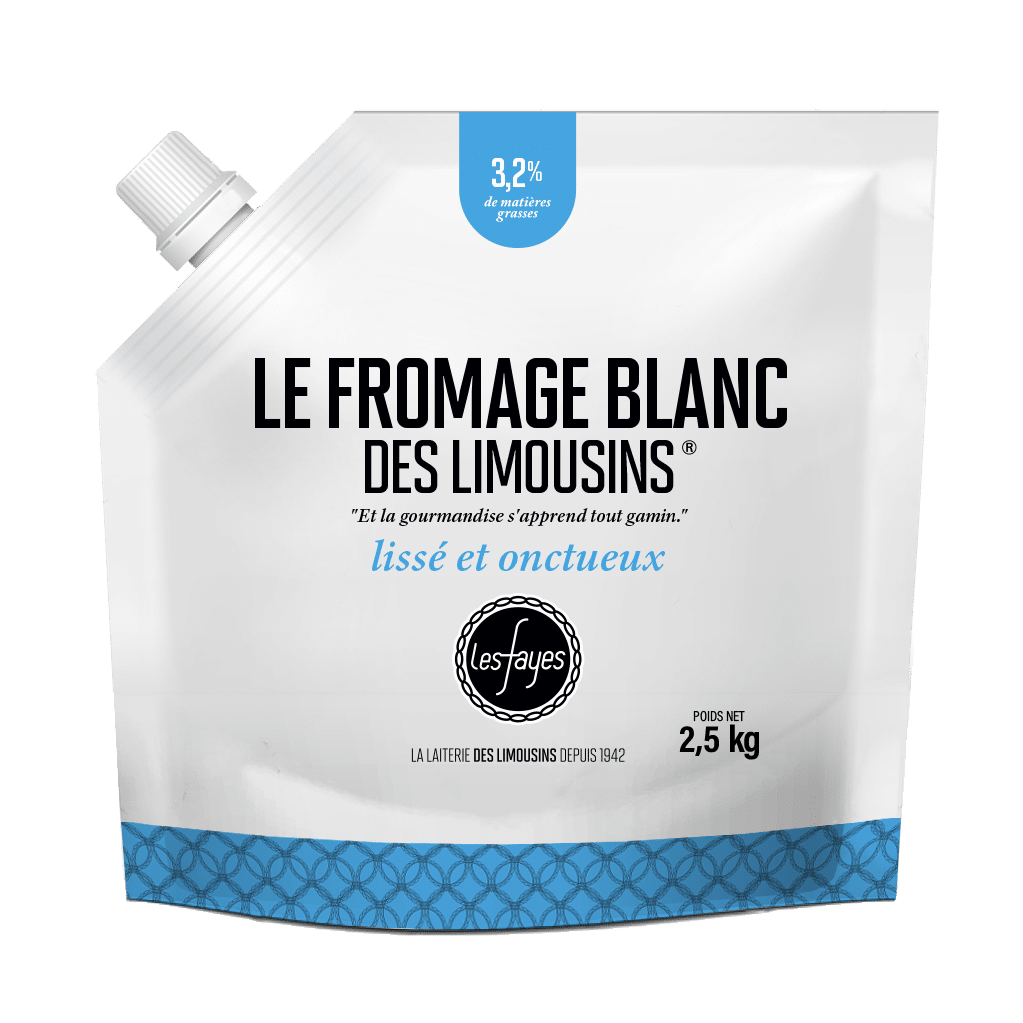 La Laiterie Les Fayes propose un fromage blanc à 3,2%MG fabriquée à partir du lait collecté chez les éleveurs Limousins. Le Fromage Blanc 3,2%MG peut aussi bien se déguster nature qu’accompagné ! En tant qu’ingrédient léger, le fromage blanc peut remplacer la crème et alléger vos recettes de gâteaux, de soufflés au fromage ou de desserts. Le format poche permet une fermeture hygiénique, le niveau restant est visible, c’est facile à mesurer pour toutes les recettes gourmandes. Il permet également une meilleure conservation et une diminution des déchets.